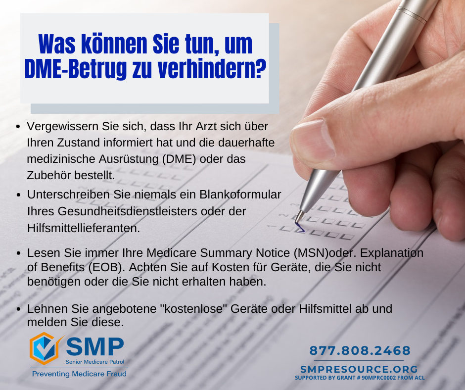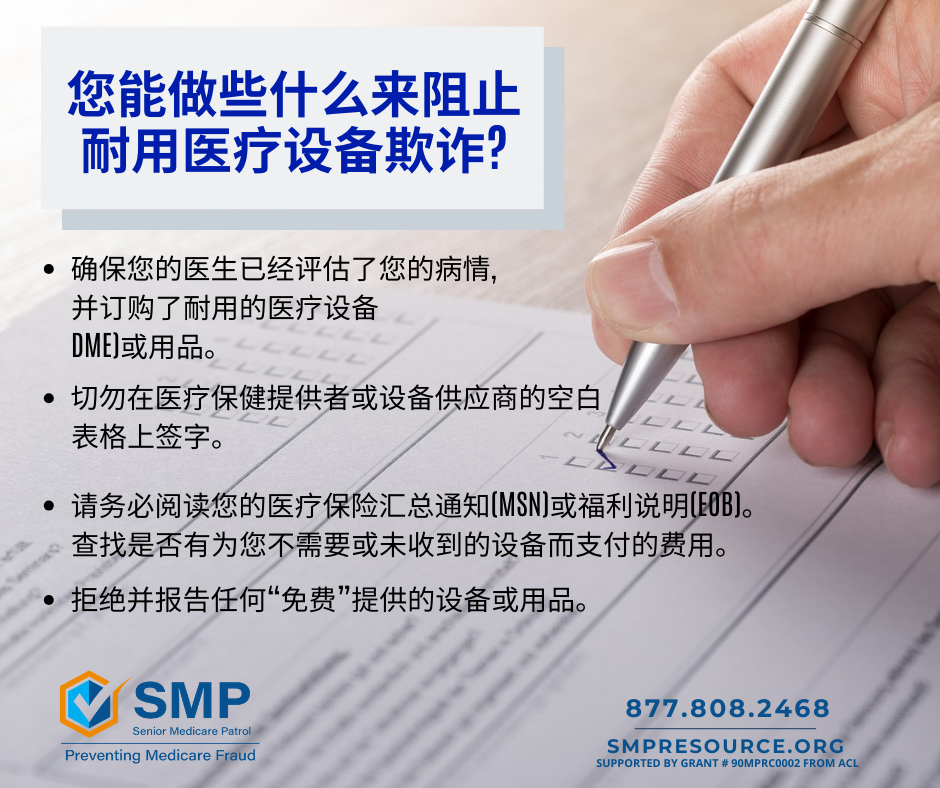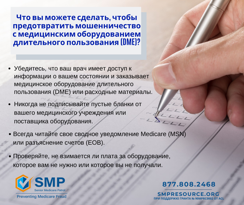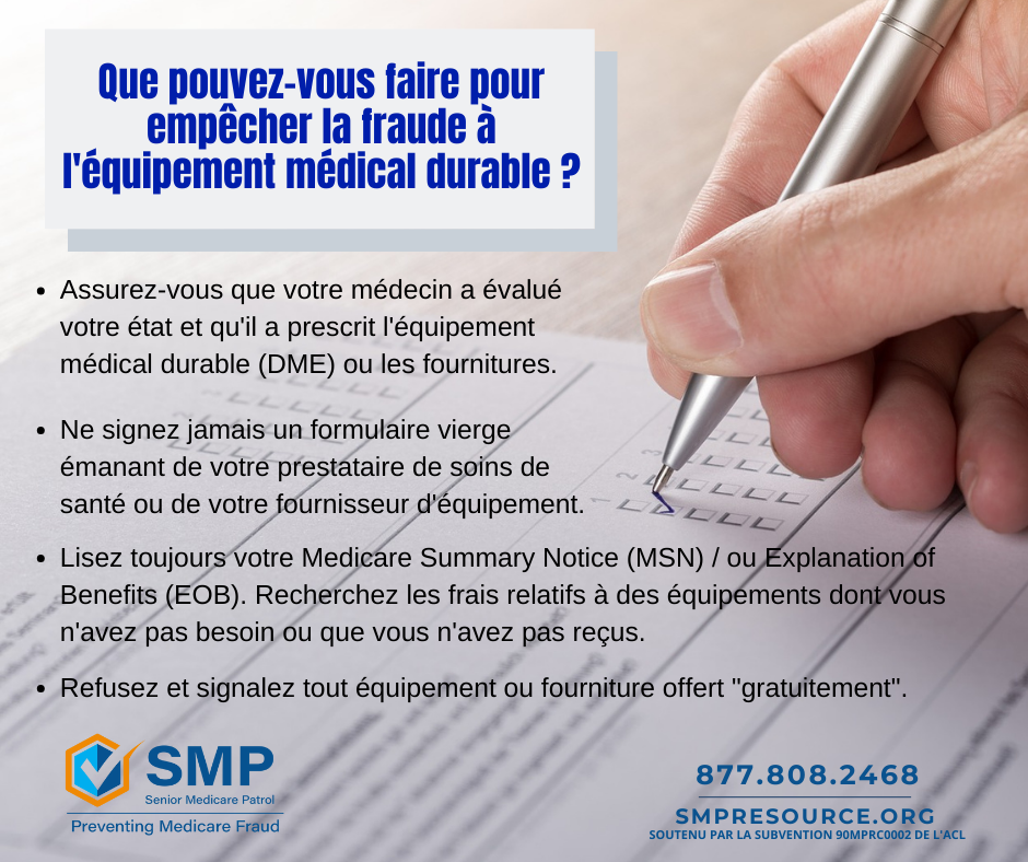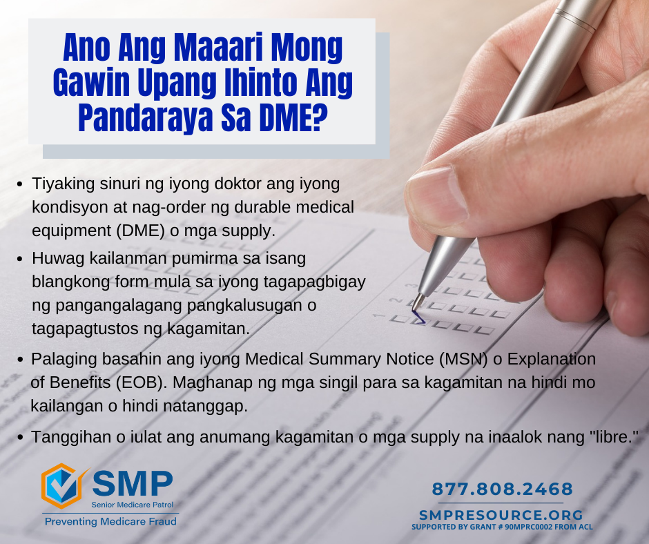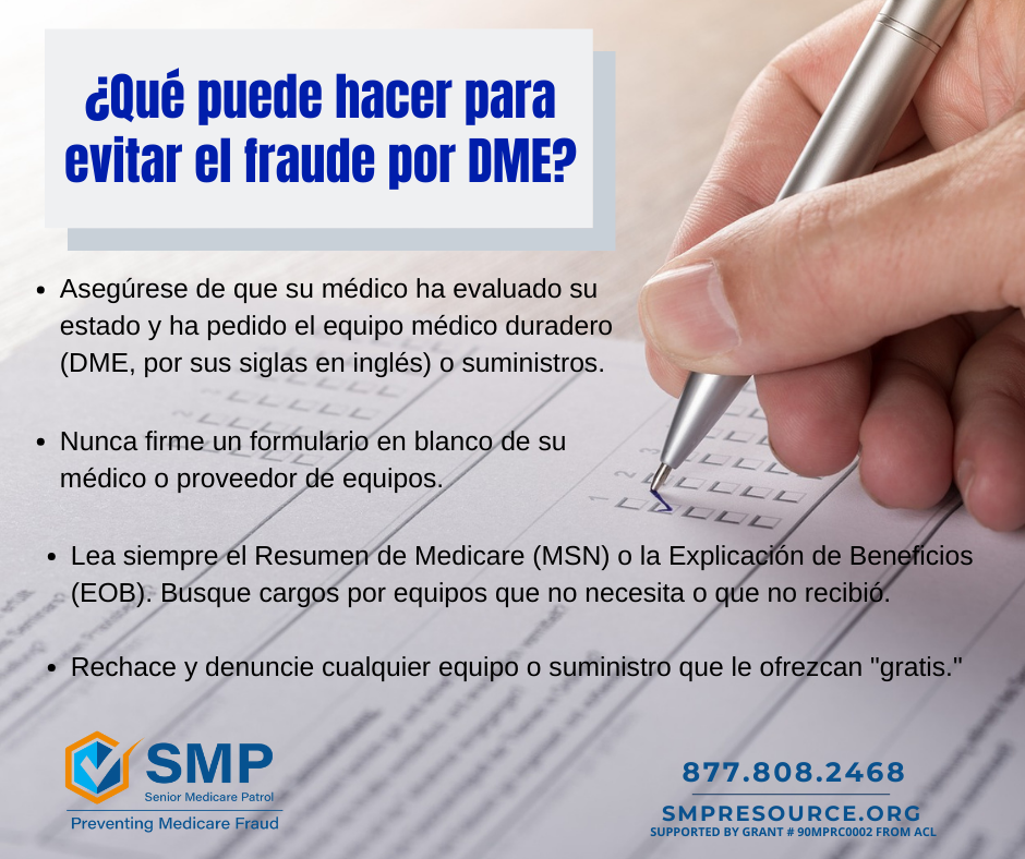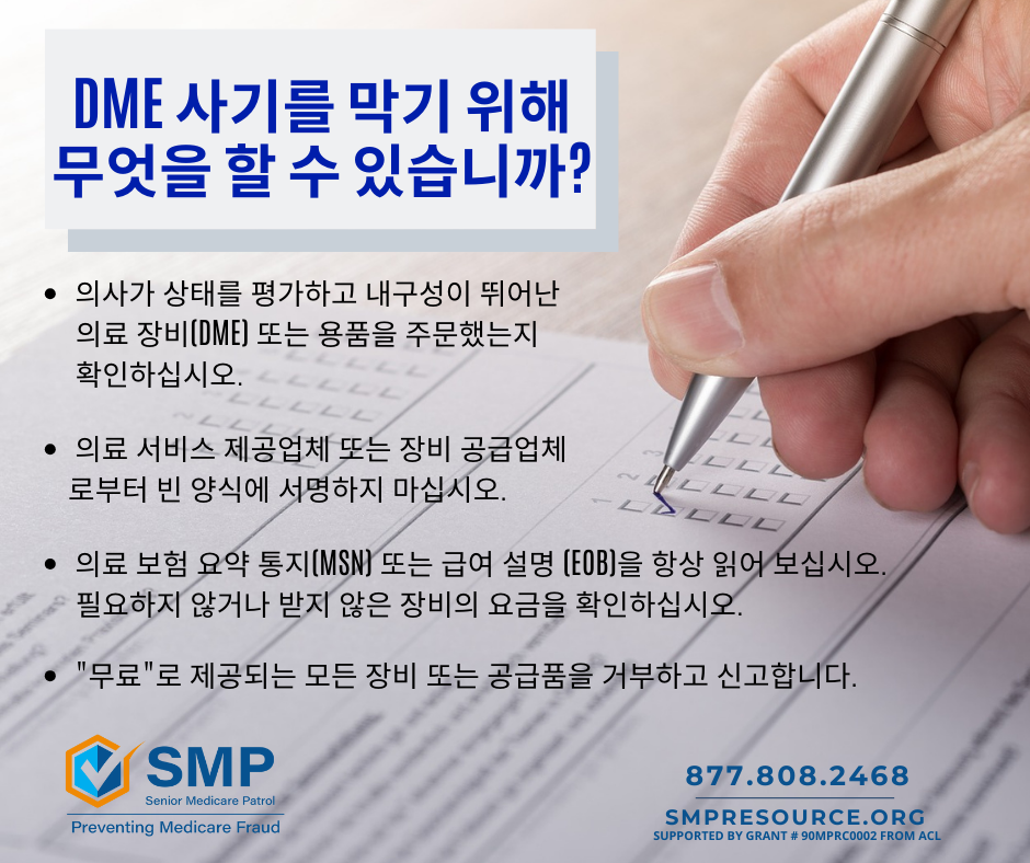 Durable medical equipment (DME) and orthotics companies offer a valuable service by providing wheelchairs, surgical supplies, catheters, and respiratory nebulizers as well as nutrition and tube feeding supplies and other health care equipment. DME and/or orthotics are considered medical equipment prescribed by your doctor that can withstand repeated use, serve a medical purpose, and can be used in the home. However, many fraudulent companies across the country are charging Medicare beneficiaries for this equipment without showing the medical necessity and sometimes without even sending the equipment to the beneficiaries.